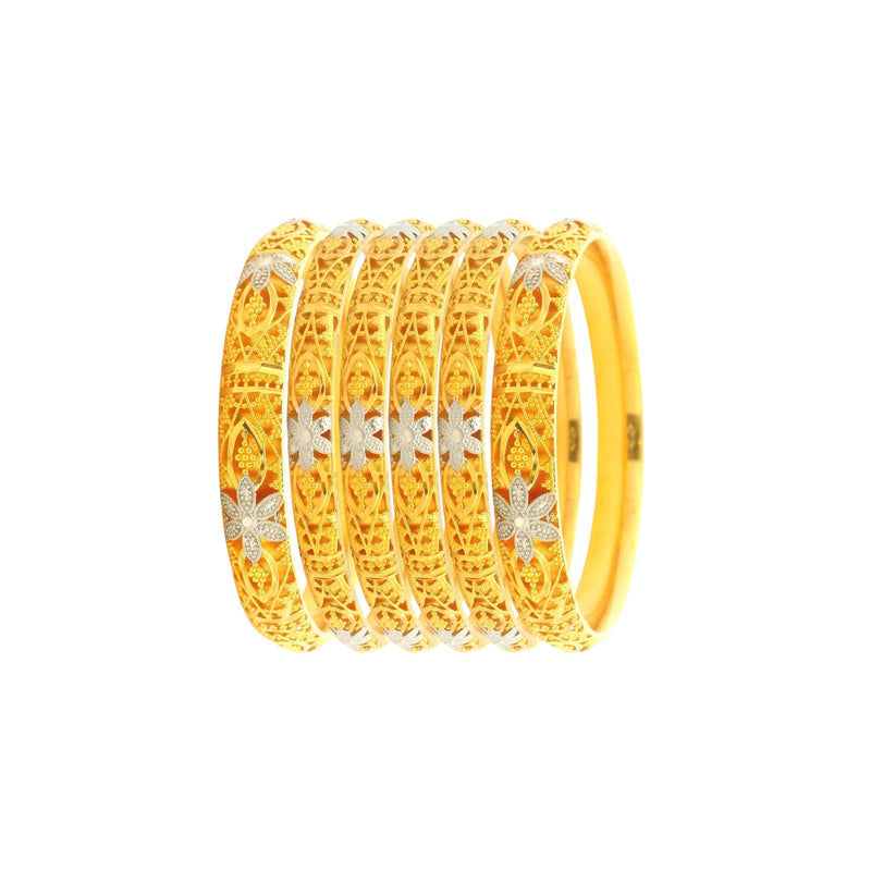 These 22KT gold ladies bangles are adorned with intricate floral motifs, highlighted by shimmering white gold accents. A graceful balance of tradition and luxury, this set is a perfect choice for weddings, festive celebrations, or elegant daily wear.