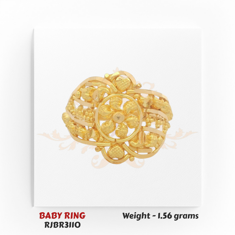 Expertly crafted in 22kt gold, this baby ring features an elaborate floral filigree design with layered openwork detailing and fine textured accents. The raised circular floral centerpiece creates a rich traditional look, while the smooth inner band ensures a gentle and comfortable fit for delicate fingers. Designed to stand out, this piece makes a meaningful keepsake for special milestones, celebrations, and gifting moments.
