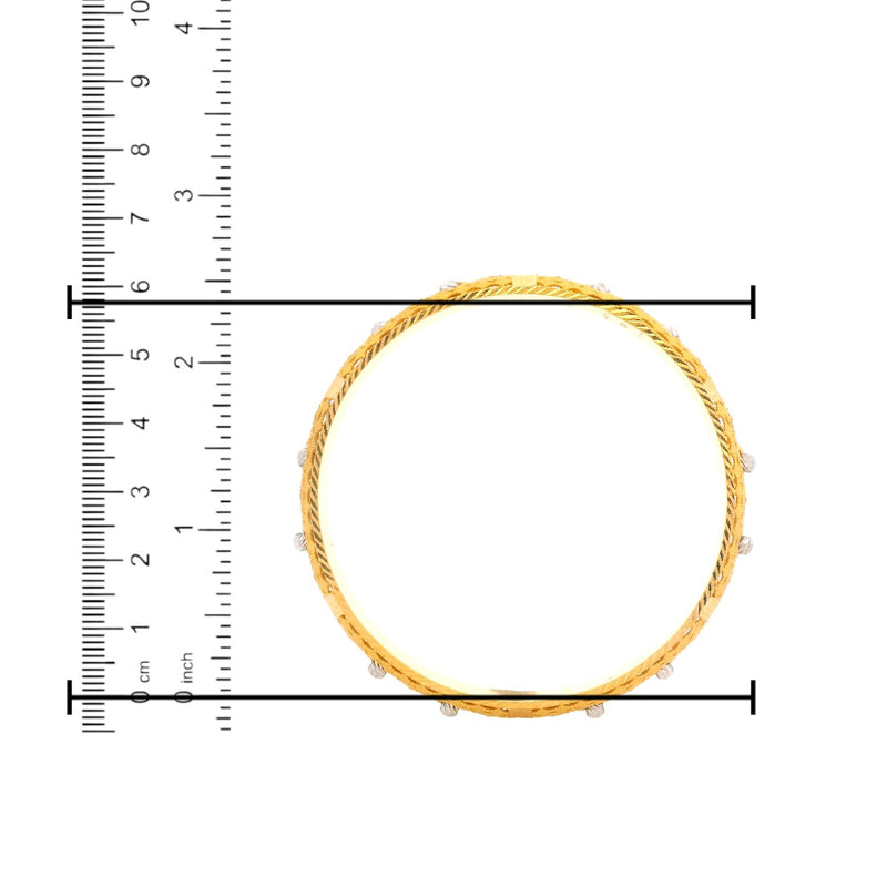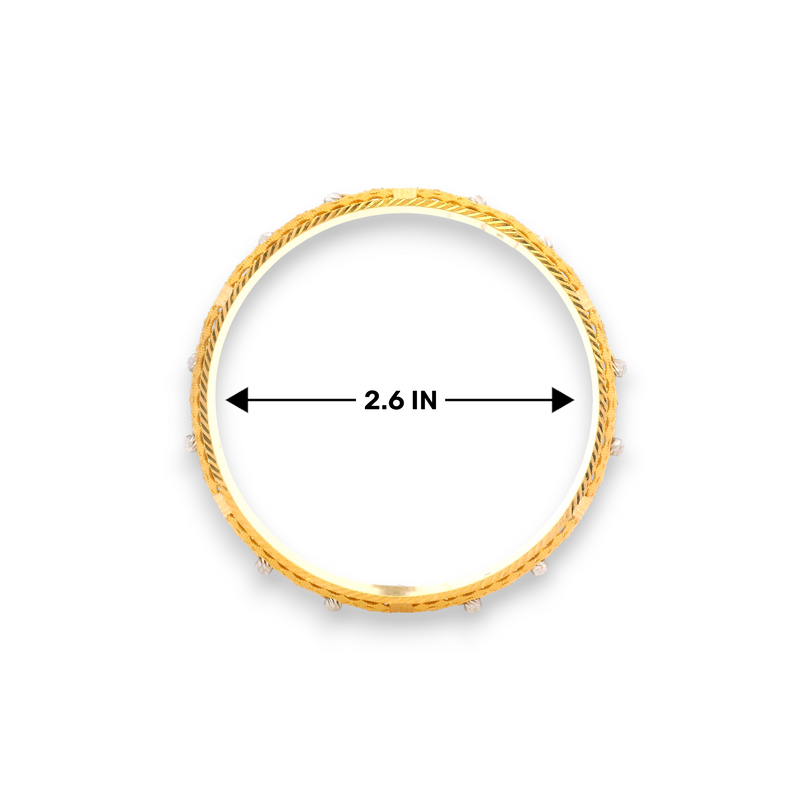 A striking blend of craftsmanship and elegance, this 22kt gold bangle set features a delicate filigree pattern highlighted with diamond-cut detailing. Its sophisticated design adds a radiant glow to traditional attire, making it the perfect choice for festive occasions, weddings, or daily wear with a touch of luxury.