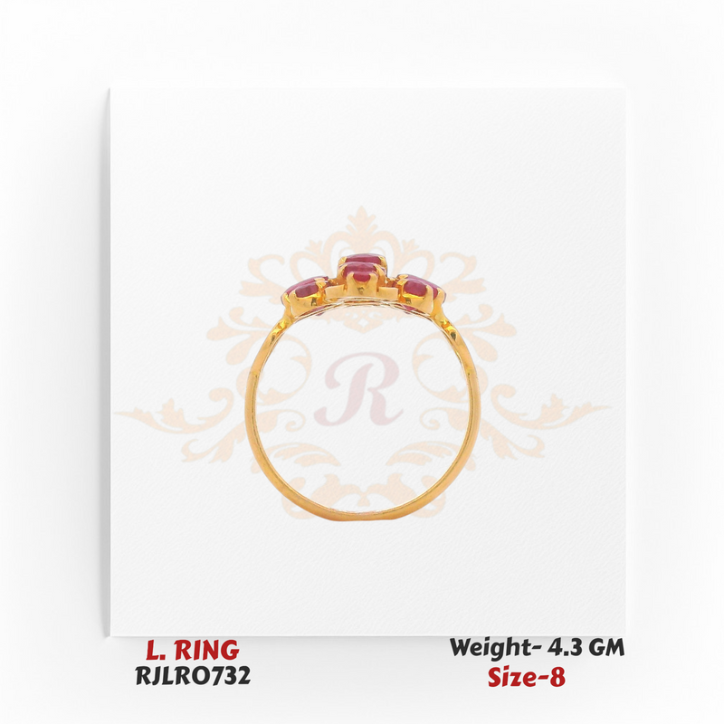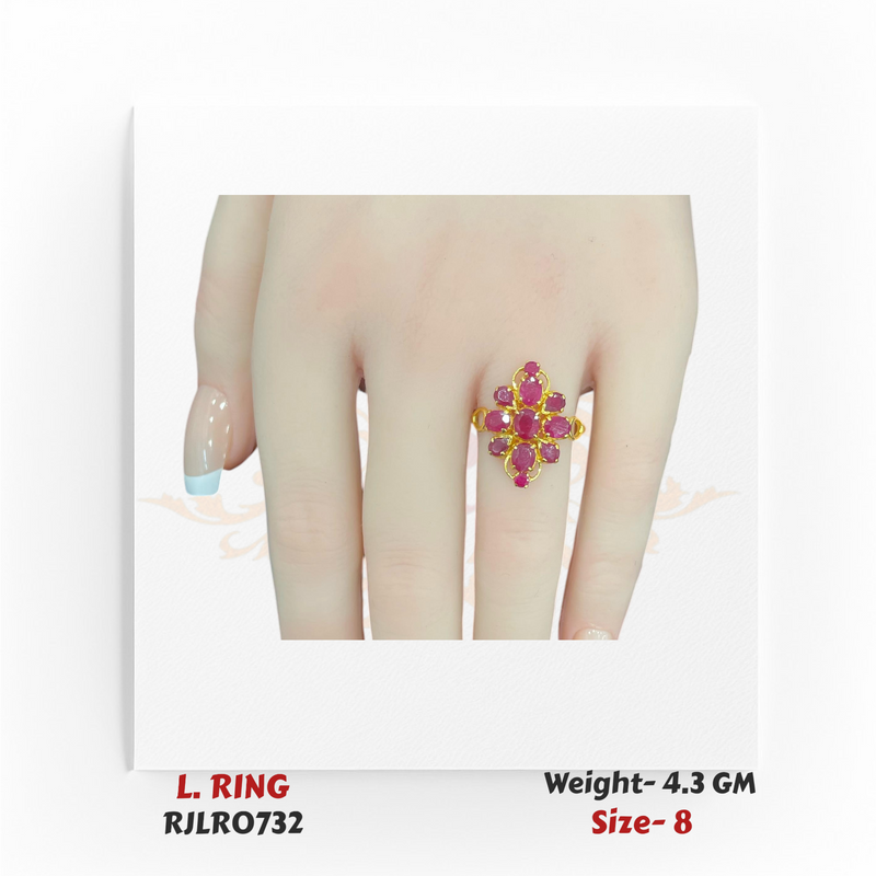 An exquisite ladies ring crafted in 22k yellow gold, showcasing a vibrant cluster of oval and round red stones arranged in a bold floral-inspired design. Its radiant color and intricate setting make it a standout piece, perfect for festive occasions, parties, or adding elegance to everyday wear.