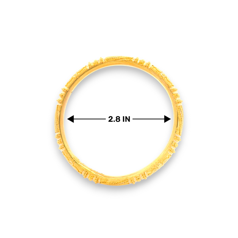 This exquisite 22kt gold bangle set captures the grandeur of traditional artistry with bold, detailed patterns and ornamental accents. Its luxurious craftsmanship makes it the ultimate statement piece, perfect for brides, festive celebrations, or anyone who desires timeless elegance with a royal touch.