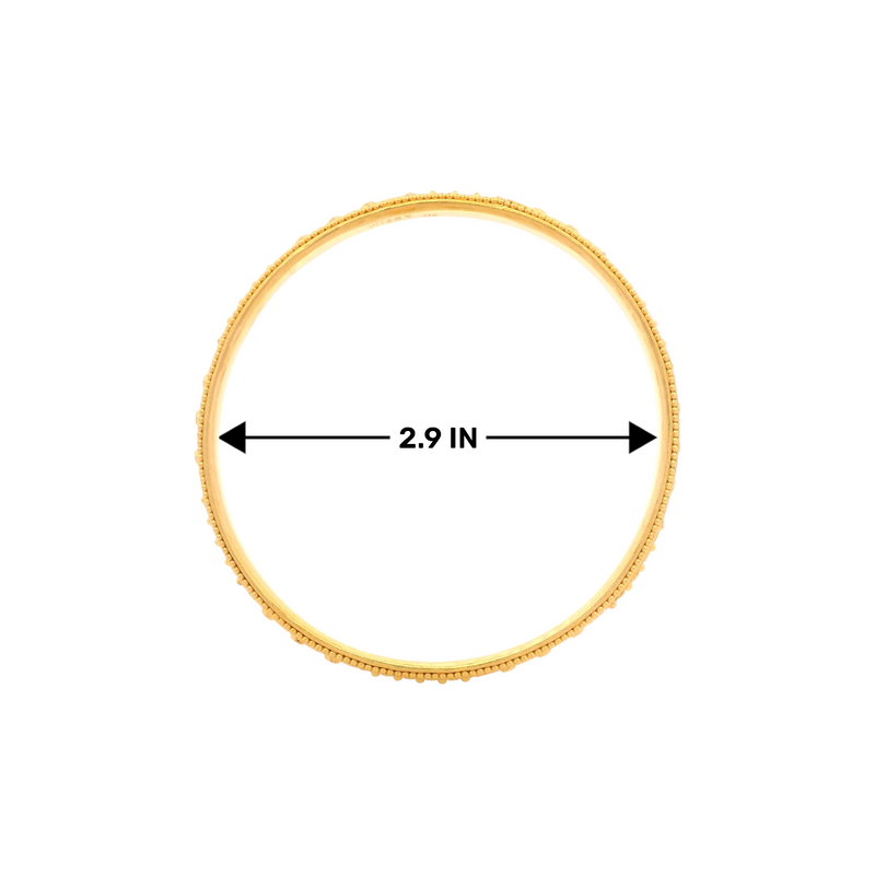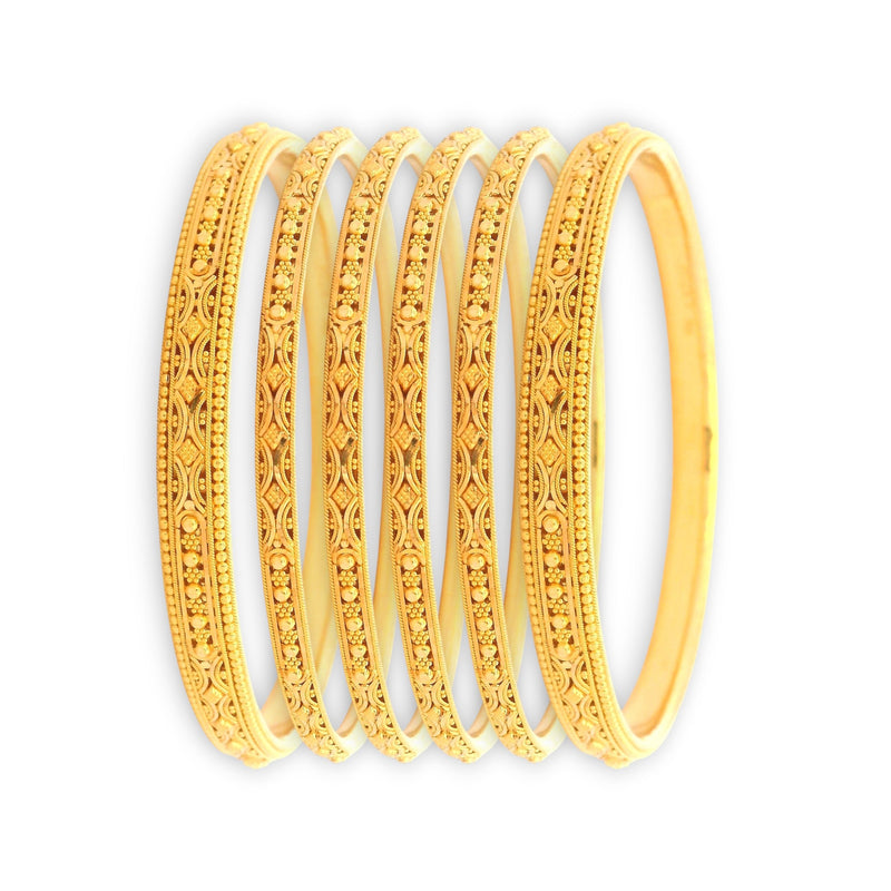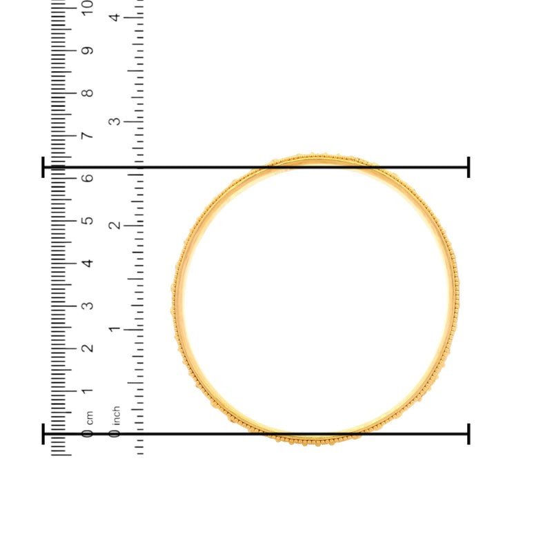 A masterpiece of craftsmanship, this 22kt gold bangle set features intricate traditional motifs with delicate beaded artistry. Designed to exude elegance and grandeur, these bangles are perfect for weddings, festive wear, or to add a regal touch to your everyday style.