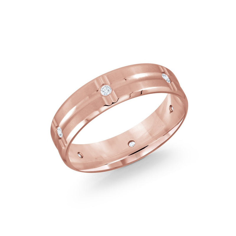 This elegant MALO diamond band features a sleek high-polish finish with a smooth comfort-fit profile, designed for everyday luxury and long-lasting wear. The ring showcases a clean modern center groove with flush-set round stones placed evenly around the band, creating a subtle sparkle from every angle. A perfect choice for a wedding band, anniversary gift, or a timeless statement ring that pairs beautifully with any style.
