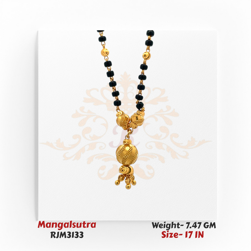 A beautifully crafted mangalsutra featuring a classic black bead chain adorned with delicate gold links and an ornate double-pendant design. The intricate detailing and traditional charm make it an ideal choice for honoring cultural heritage with elegance.