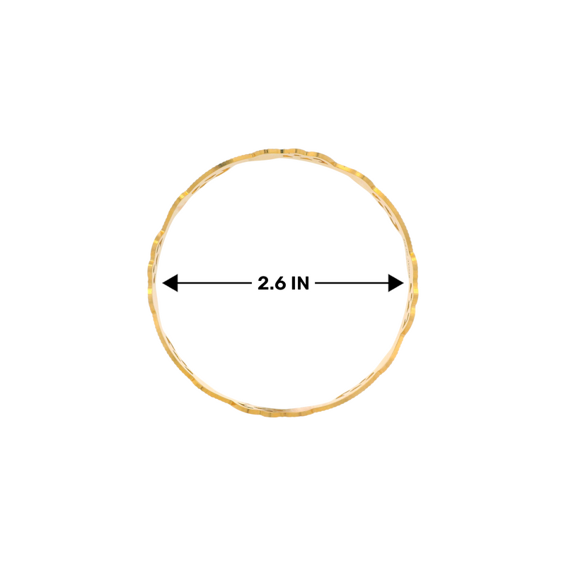 This stunning set of 22kt gold ladies bangles features a unique cutwork floral design with ornate open patterns, giving them a modern yet traditional appeal. The handcrafted detailing enhances their elegance, making these bangles perfect for brides, festive occasions, or as statement accessories for luxury wear.