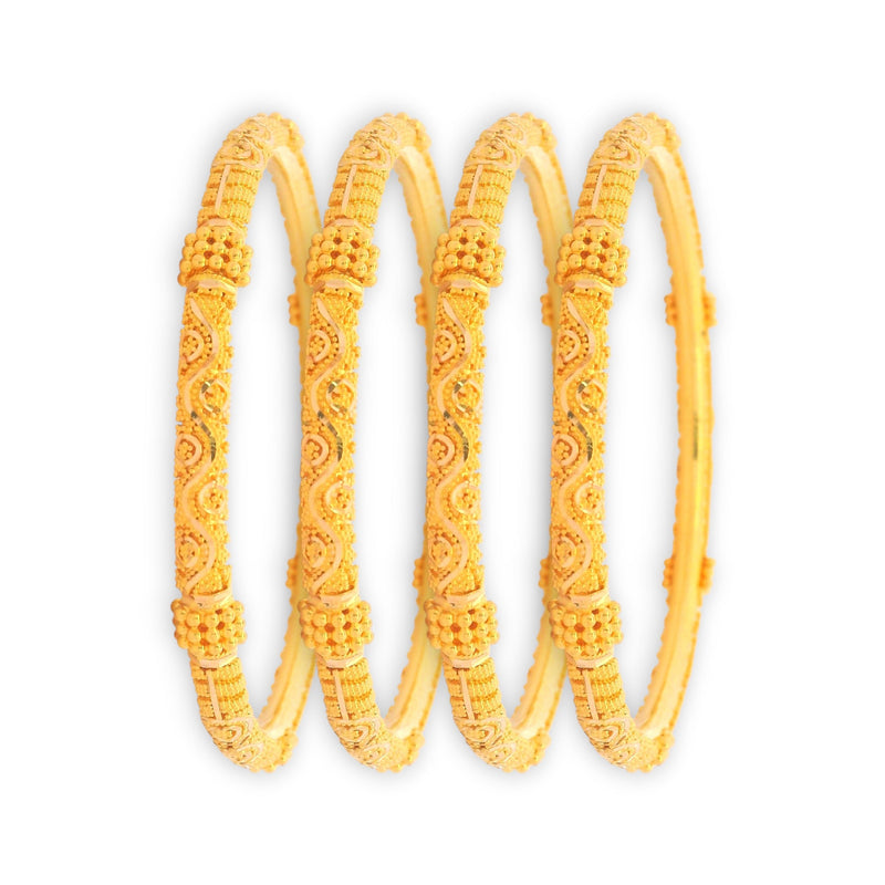 This captivating set of 22kt gold ladies bangles features intricate floral motifs with delicate beaded accents, showcasing a true blend of tradition and artistry. Designed with a rich antique-inspired pattern and radiant polish, these bangles add a luxurious charm that makes them perfect for weddings, festive occasions, or heirloom-worthy collections.