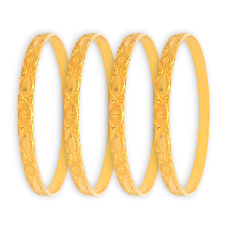 These 22kt gold ladies bangles feature a striking leaf-and-circle engraved motif, blending intricate traditional patterns with a modern, radiant polish. Lightweight yet durable, they make the perfect jewelry choice for weddings, festive occasions, or daily wear, adding an effortless touch of luxury to any outfit.