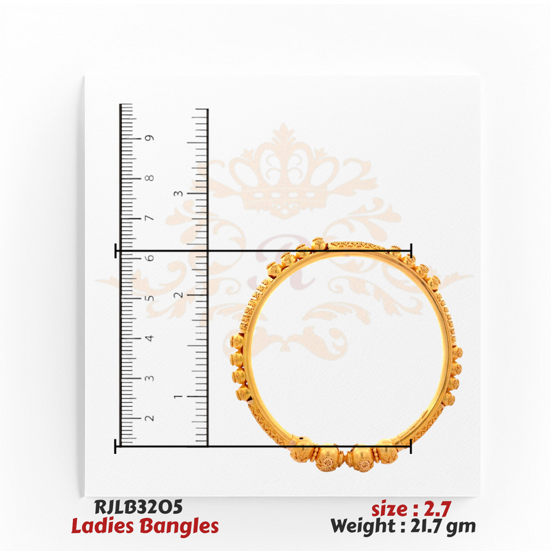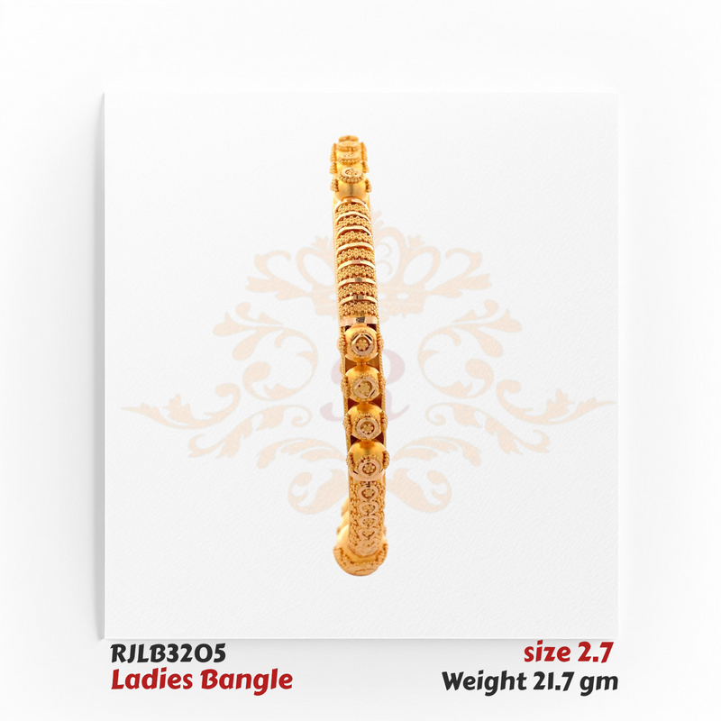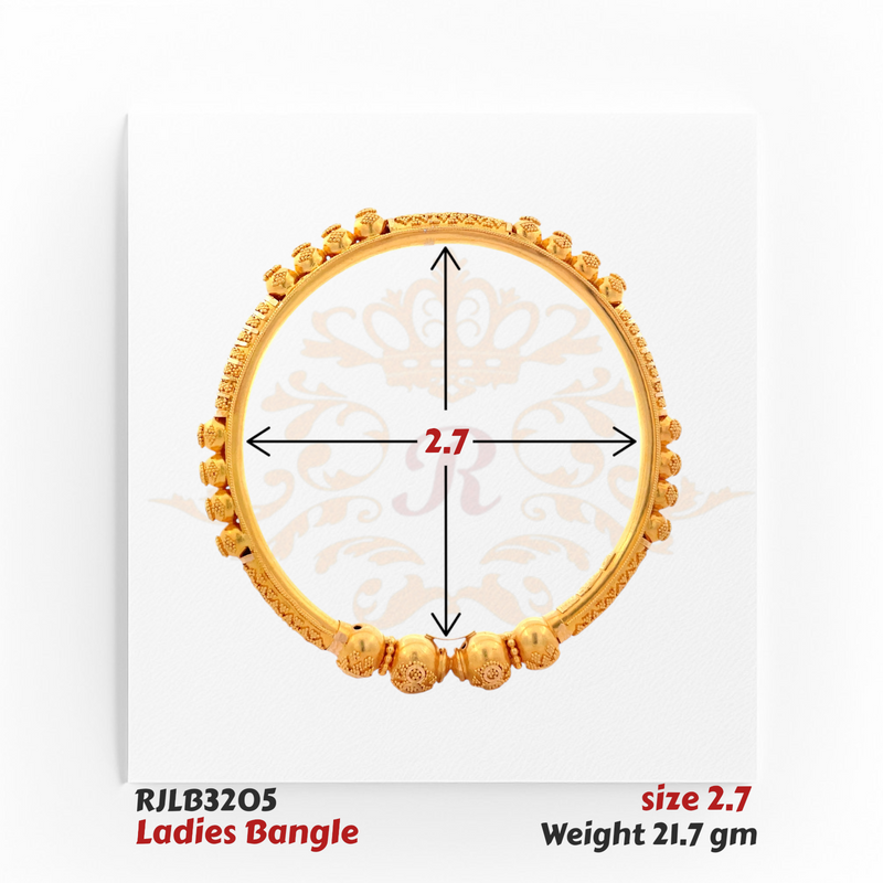An exquisite 22kt gold bangle adorned with intricate beaded accents and engraved patterns, giving it a distinctive traditional flair. Its lightweight yet bold design makes it a perfect choice for festive occasions or cultural celebrations.