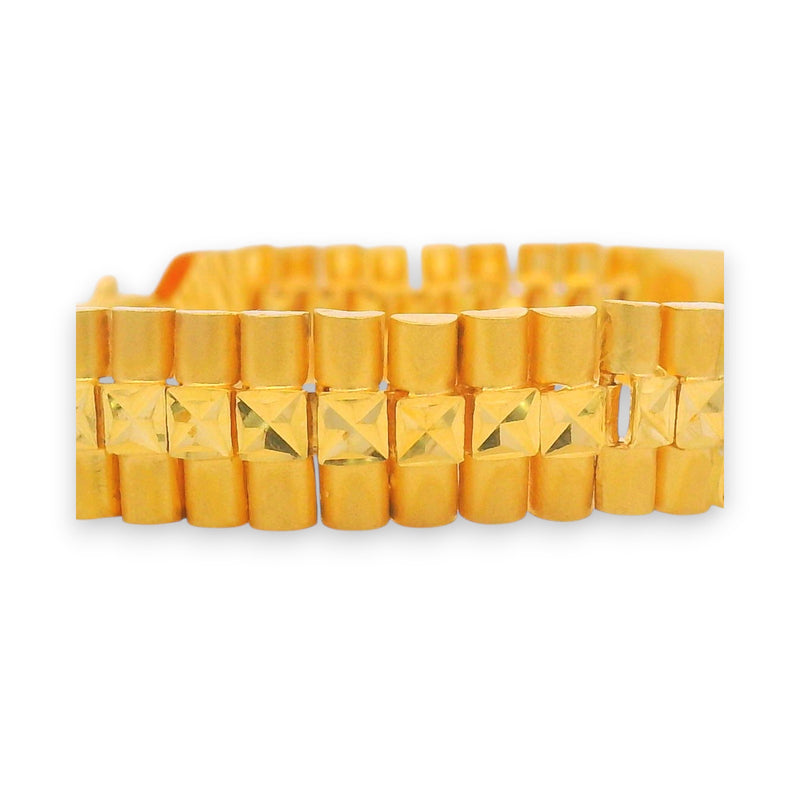 This elegant 22kt gold men’s bracelet showcases the revered Khanda emblem on a dual-tone white and gold centerpiece, symbolizing faith, strength, and unity. The bracelet features textured square links, combining durability with style, making it both a spiritual and fashionable choice for modern men.