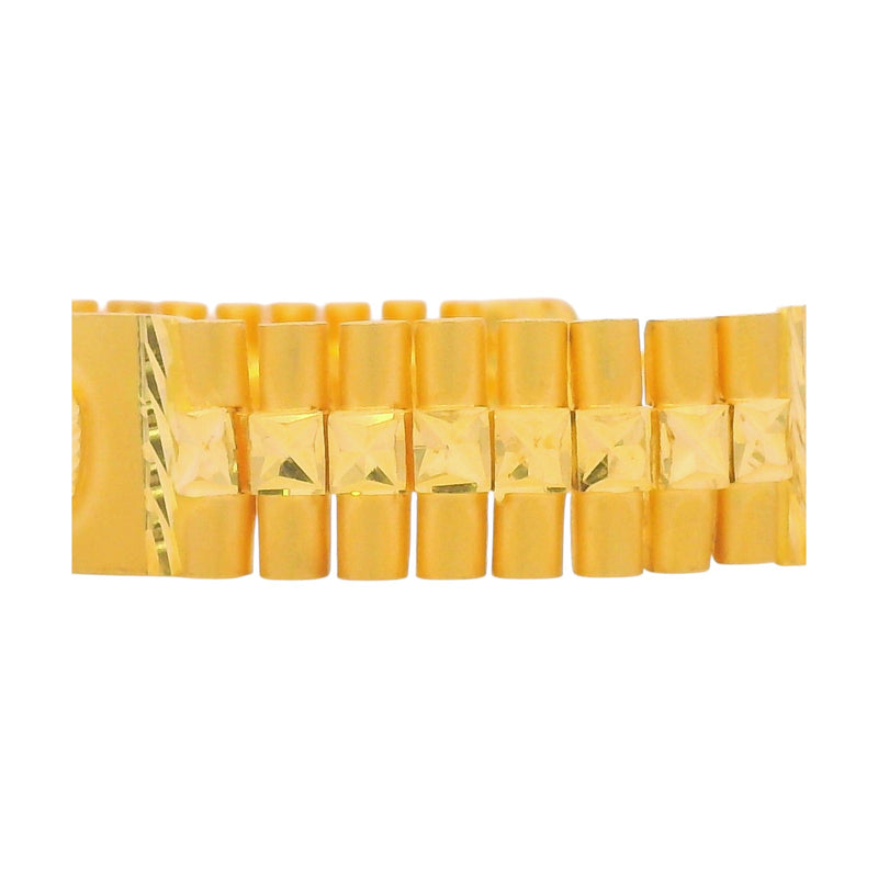 This powerful 22kt gold men’s bracelet features a bold Om symbol centerpiece, representing divine energy, peace, and protection. The detailed textured links enhance its masculine appeal, while the polished finish gives it a refined look. A meaningful and stylish piece, perfect for those who want to carry spiritual strength with elegance.