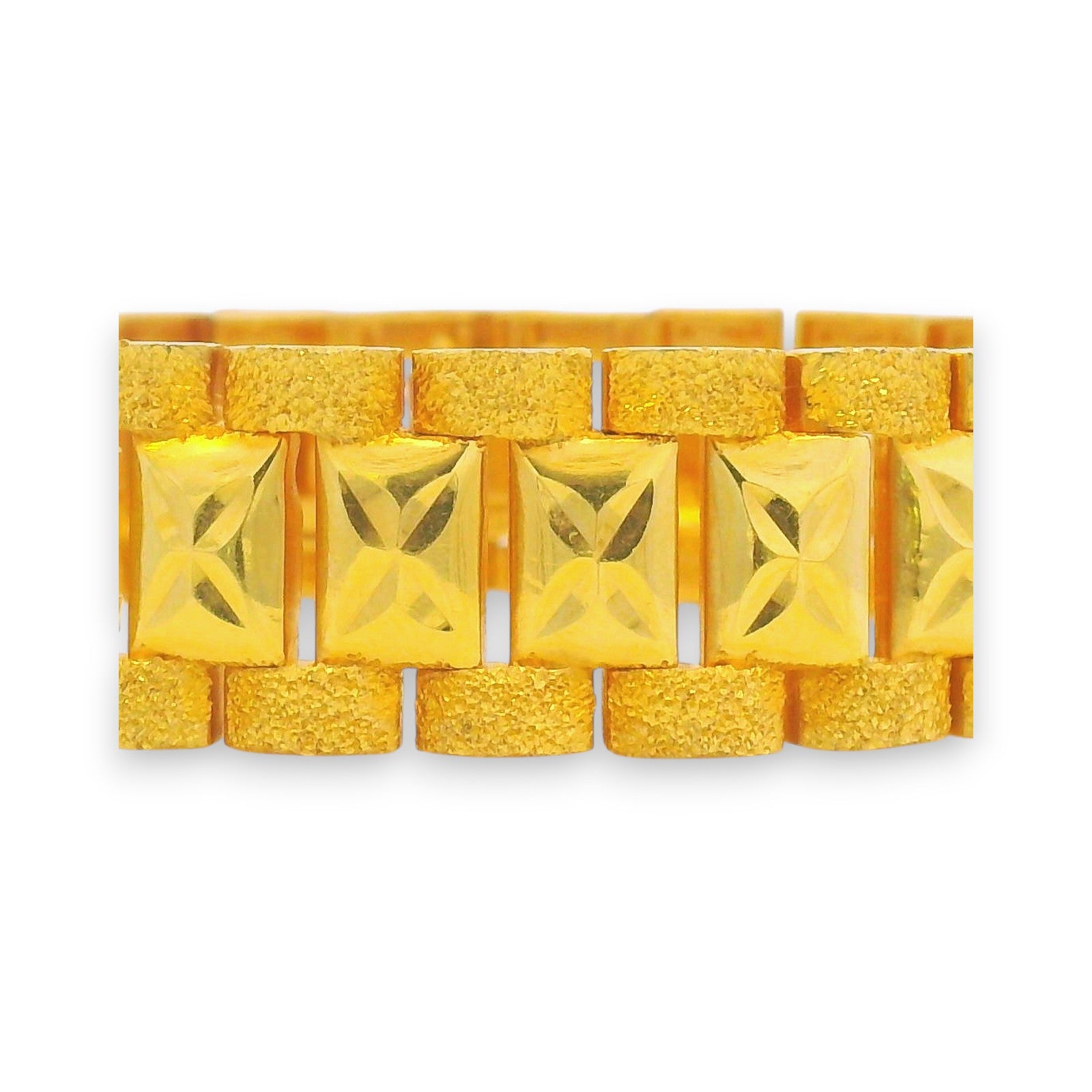 This striking 22kt gold men’s bracelet features bold rectangular links with a geometric engraved design, balanced by textured matte accents that add depth and contrast. With its wide and sturdy form, it radiates masculine elegance and strength, making it a standout accessory for both daily wear and formal occasions.