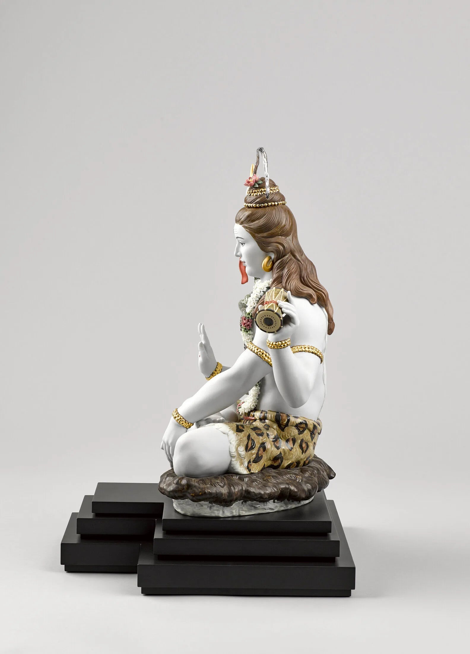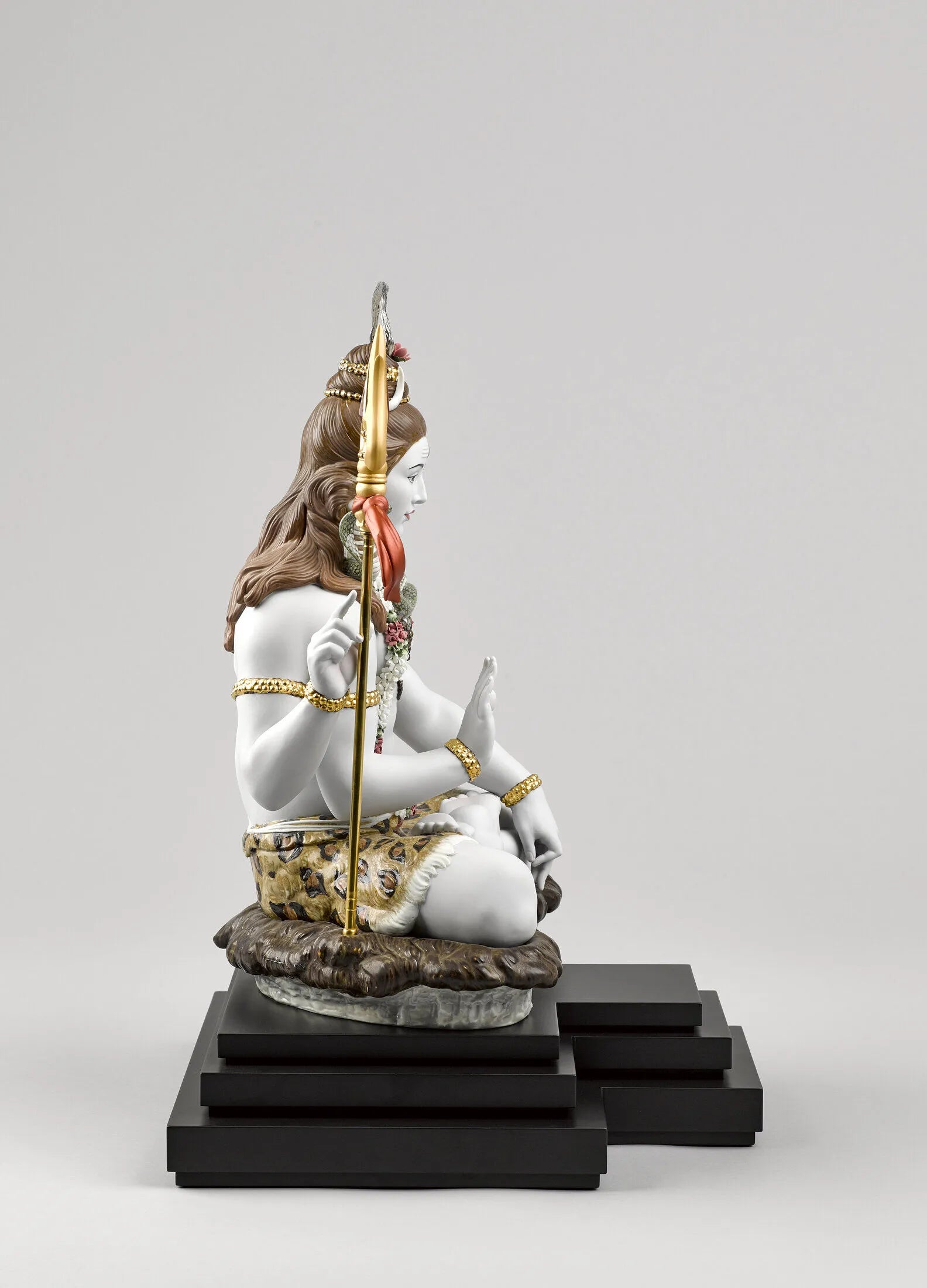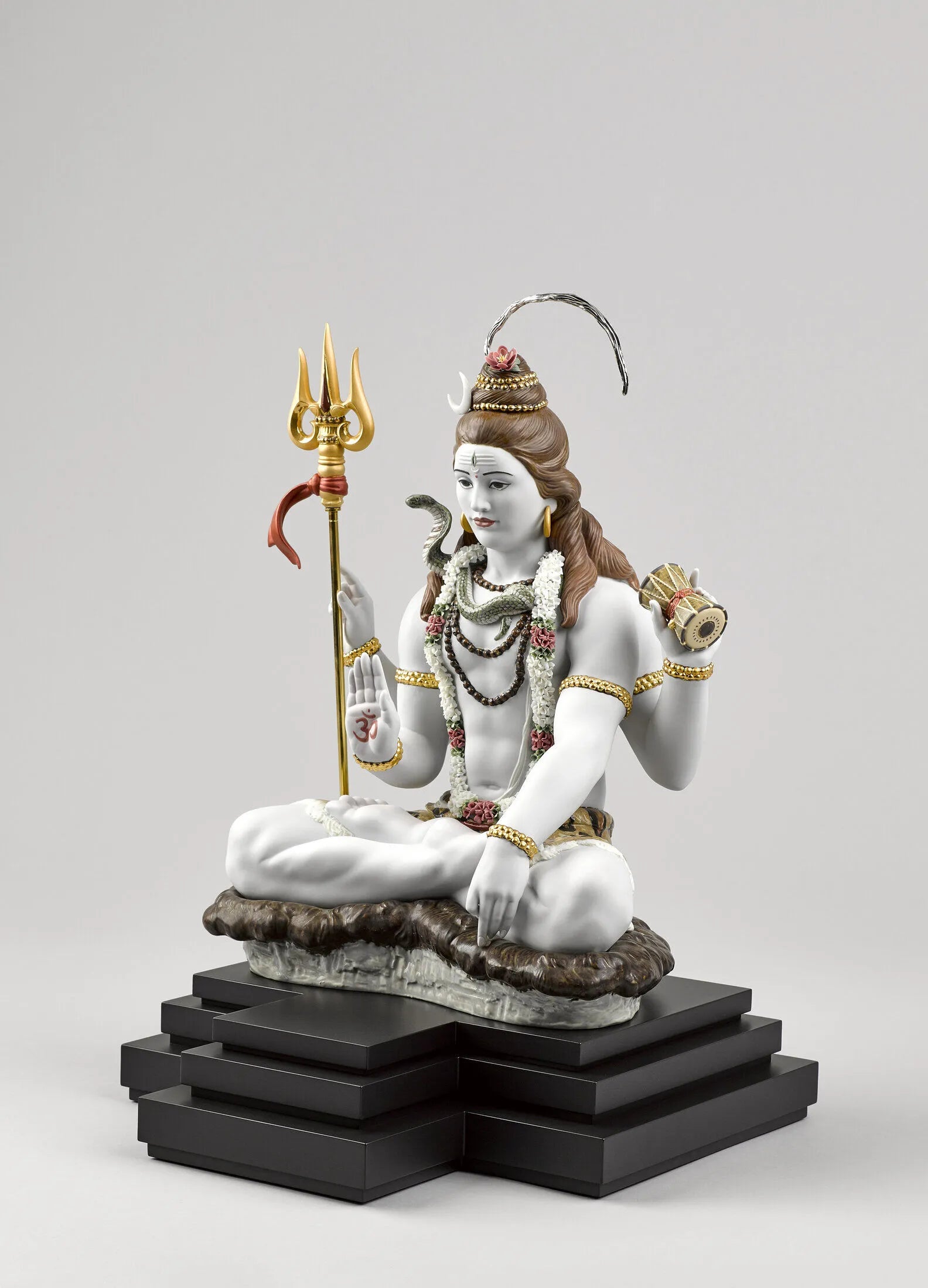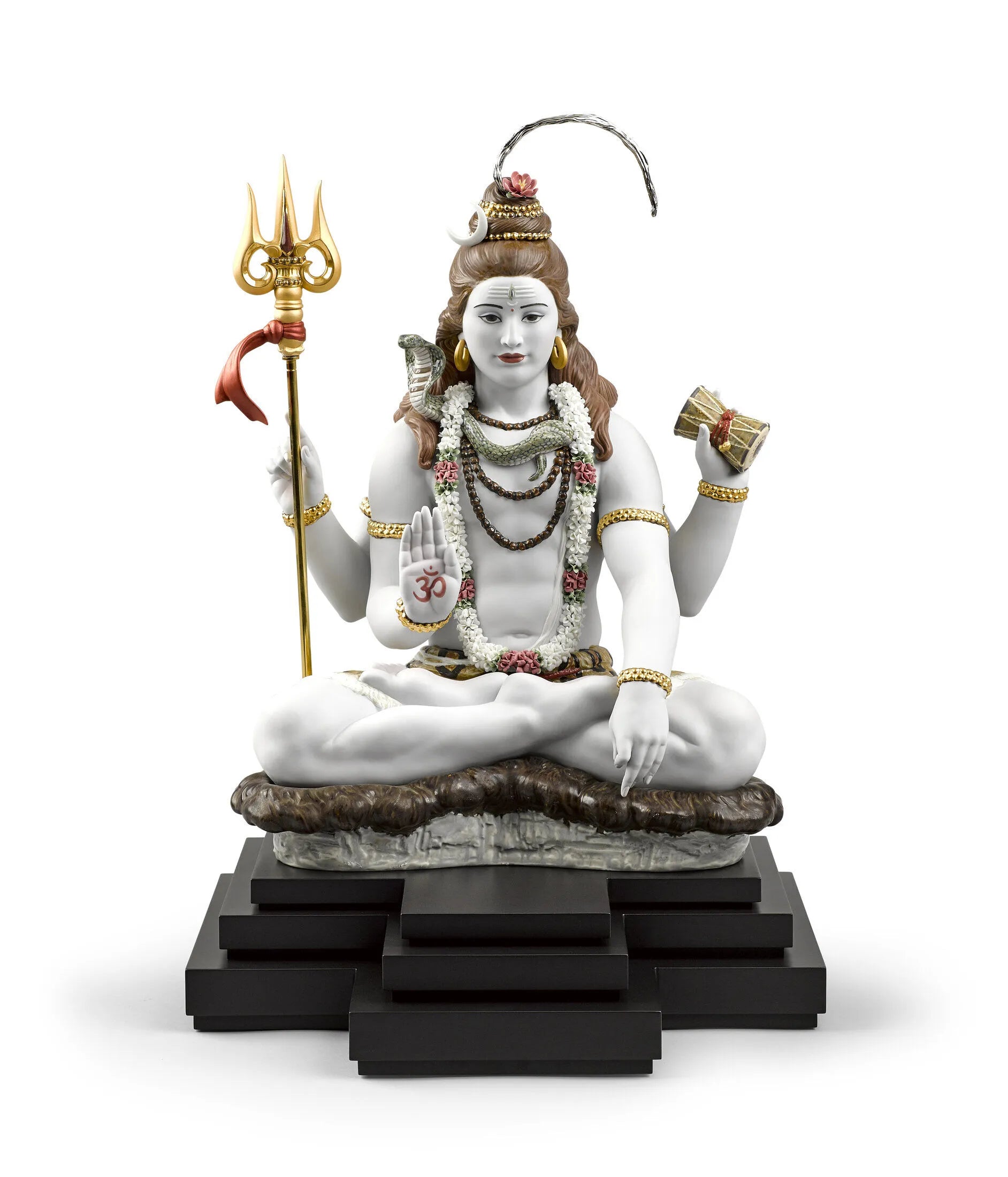 Lord Shiva, the Hindu god of meditation and the arts, in a sculpture made in High Porcelain, Lladrós maximum artistic category. A piece that boasts many complex decorative techniques, like golden luster, and a large amount of handmade flowers made petal by petal. Shivas attributes are finely defined with a host of details enhancing his majestic character: the trident, the drum, the snake, the bands of Rudraksha and the bun in his hair. The base provides room for the optional piece Lingam (01001981), a symbol used to worship Shiva and to overcome any situation that impedes personal growth.