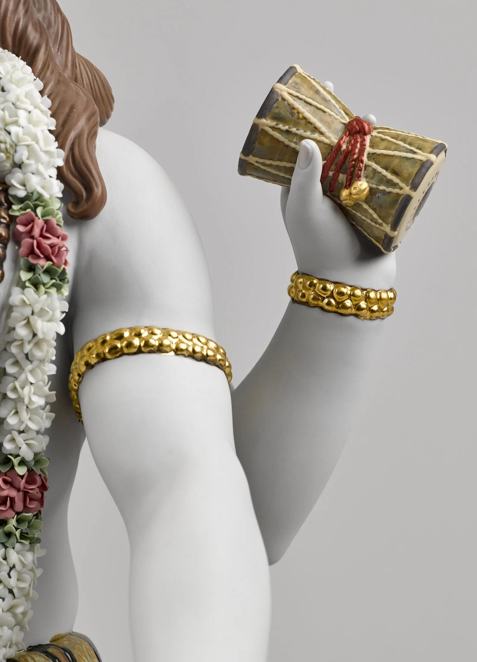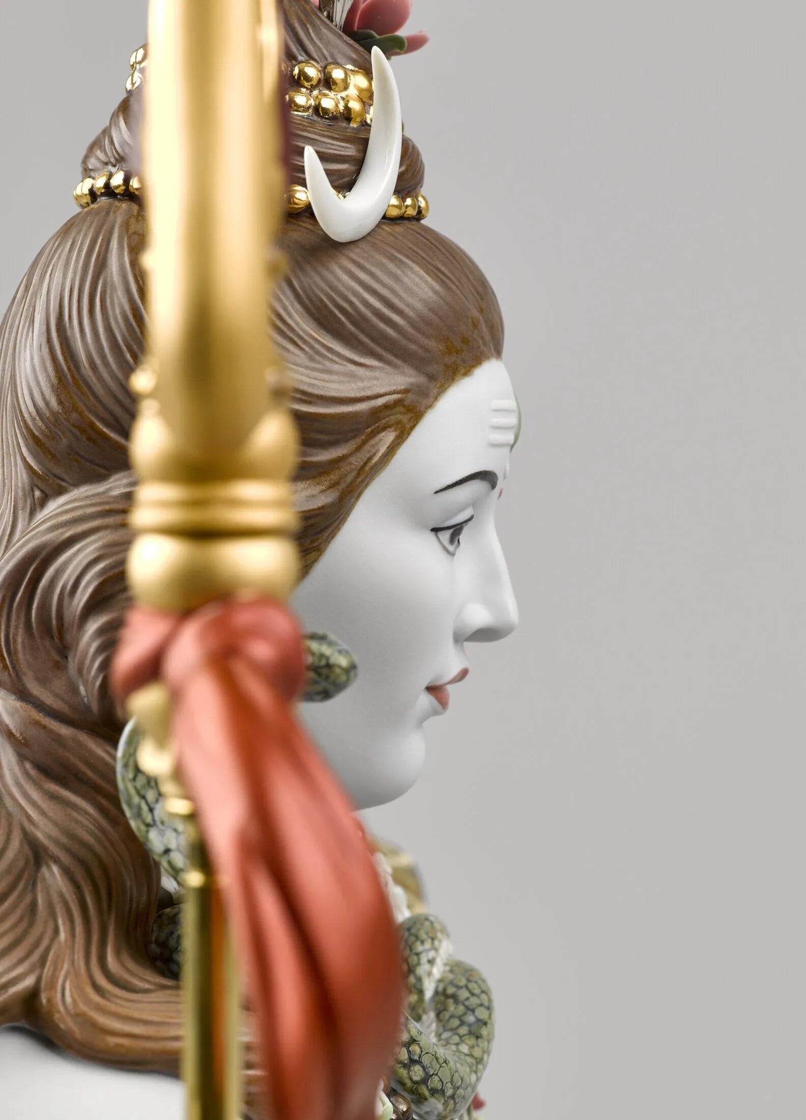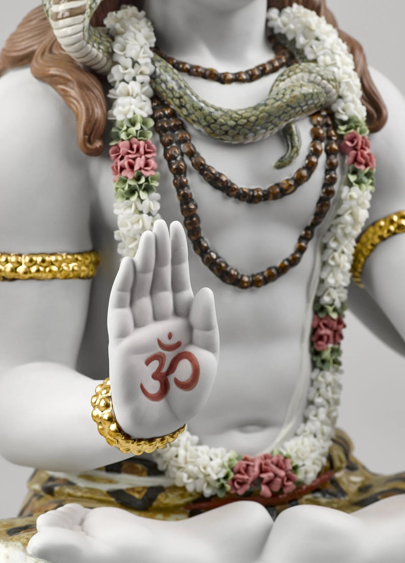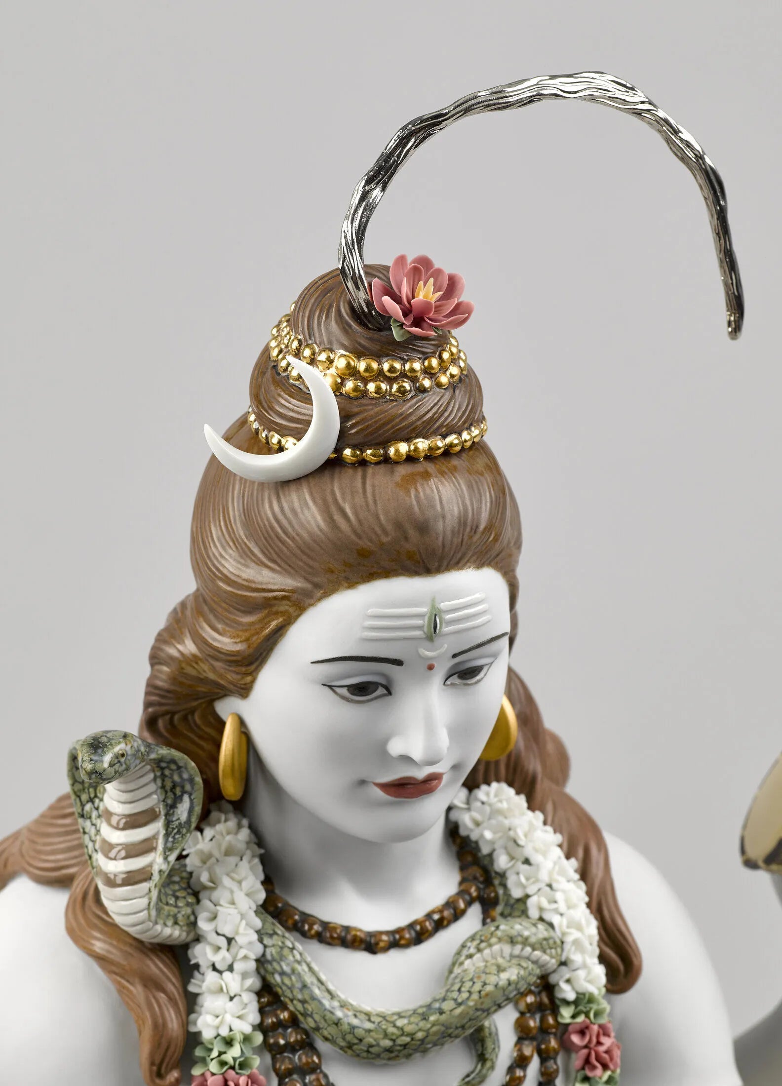 Lord Shiva, the Hindu god of meditation and the arts, in a sculpture made in High Porcelain, Lladrós maximum artistic category. A piece that boasts many complex decorative techniques, like golden luster, and a large amount of handmade flowers made petal by petal. Shivas attributes are finely defined with a host of details enhancing his majestic character: the trident, the drum, the snake, the bands of Rudraksha and the bun in his hair. The base provides room for the optional piece Lingam (01001981), a symbol used to worship Shiva and to overcome any situation that impedes personal growth.