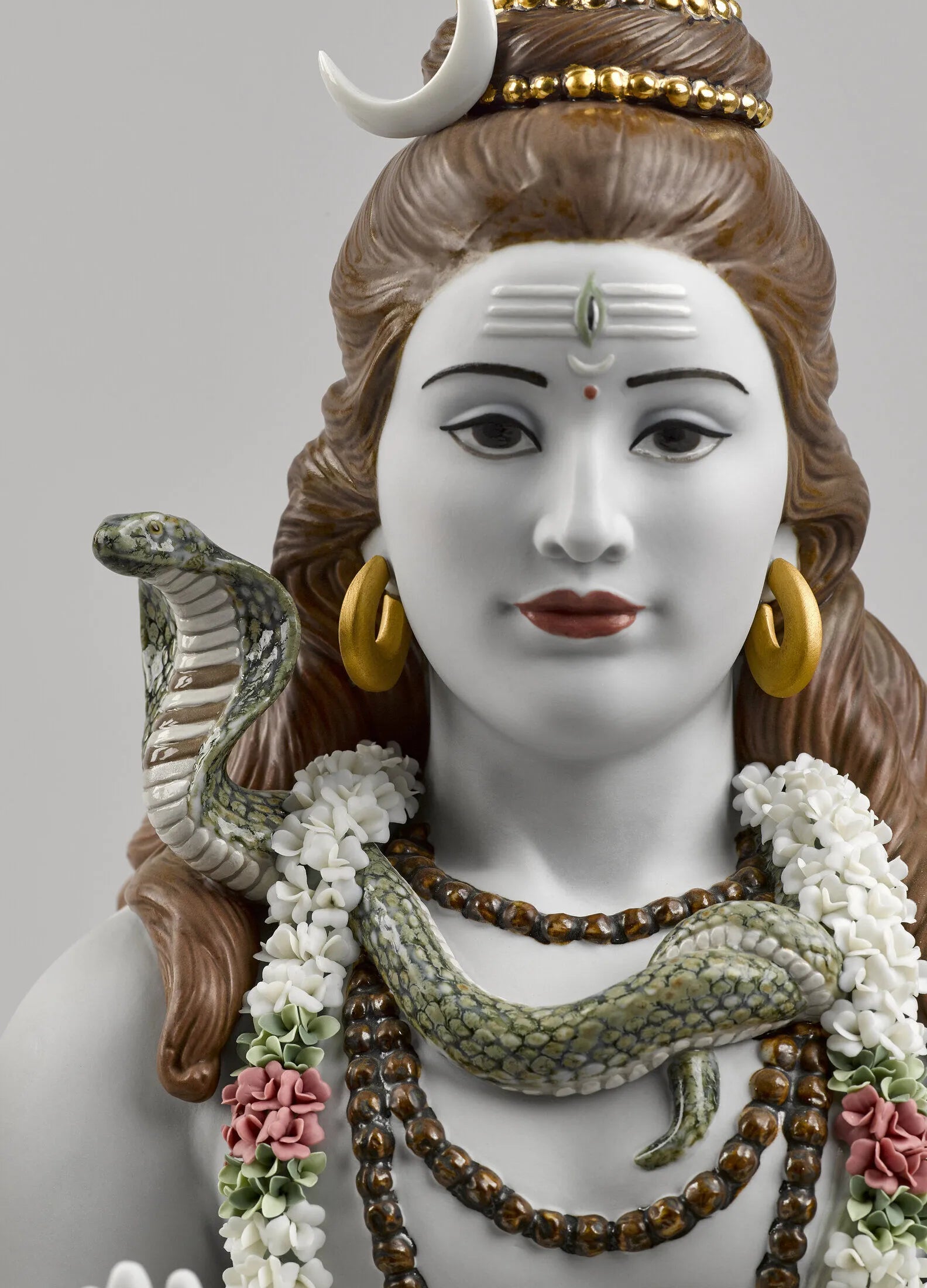 Sculpture of the Hindu god Lord Shiva in white porcelain with gold lustre and handmade flowers.