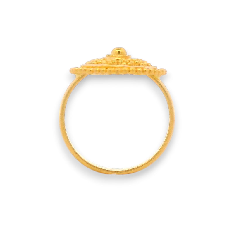 This 22kt gold baby ring features a round floral-inspired design with intricate beadwork and a raised central motif. Its artistic craftsmanship and lightweight structure make it both comfortable and visually striking, perfect as a meaningful gift for little ones on birthdays, baby showers, or festive occasions.