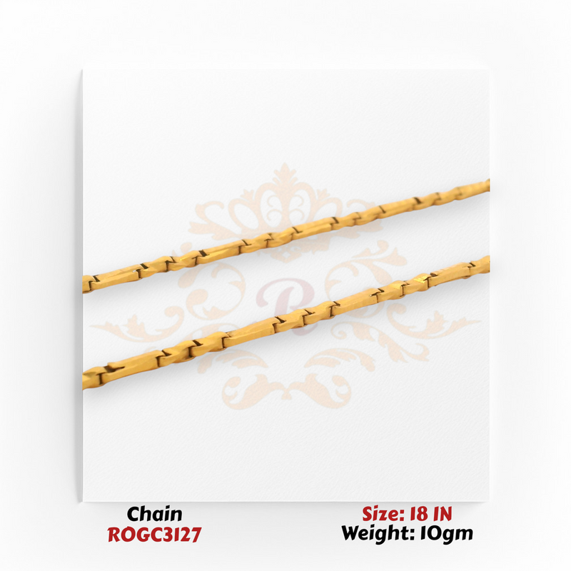 This sleek and stylish 22kt gold chain from Regal Jewels features uniquely cut designer links that reflect light beautifully. Crafted for a modern yet timeless look, this Regal Jewels chain is perfect for daily wear or pairing with lightweight pendants for an elegant finish.