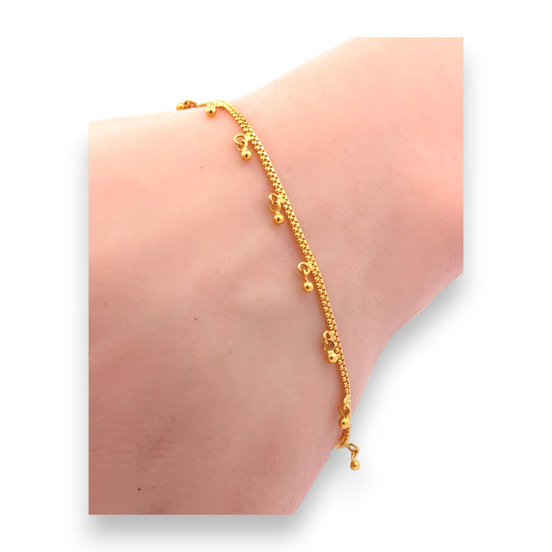 A beautifully handcrafted 22kt gold ladies bracelet featuring fine linked chains adorned with delicate drop beads. The timeless traditional design offers a graceful touch of movement and shine, perfect for festive occasions, weddings, or elegant everyday wear.