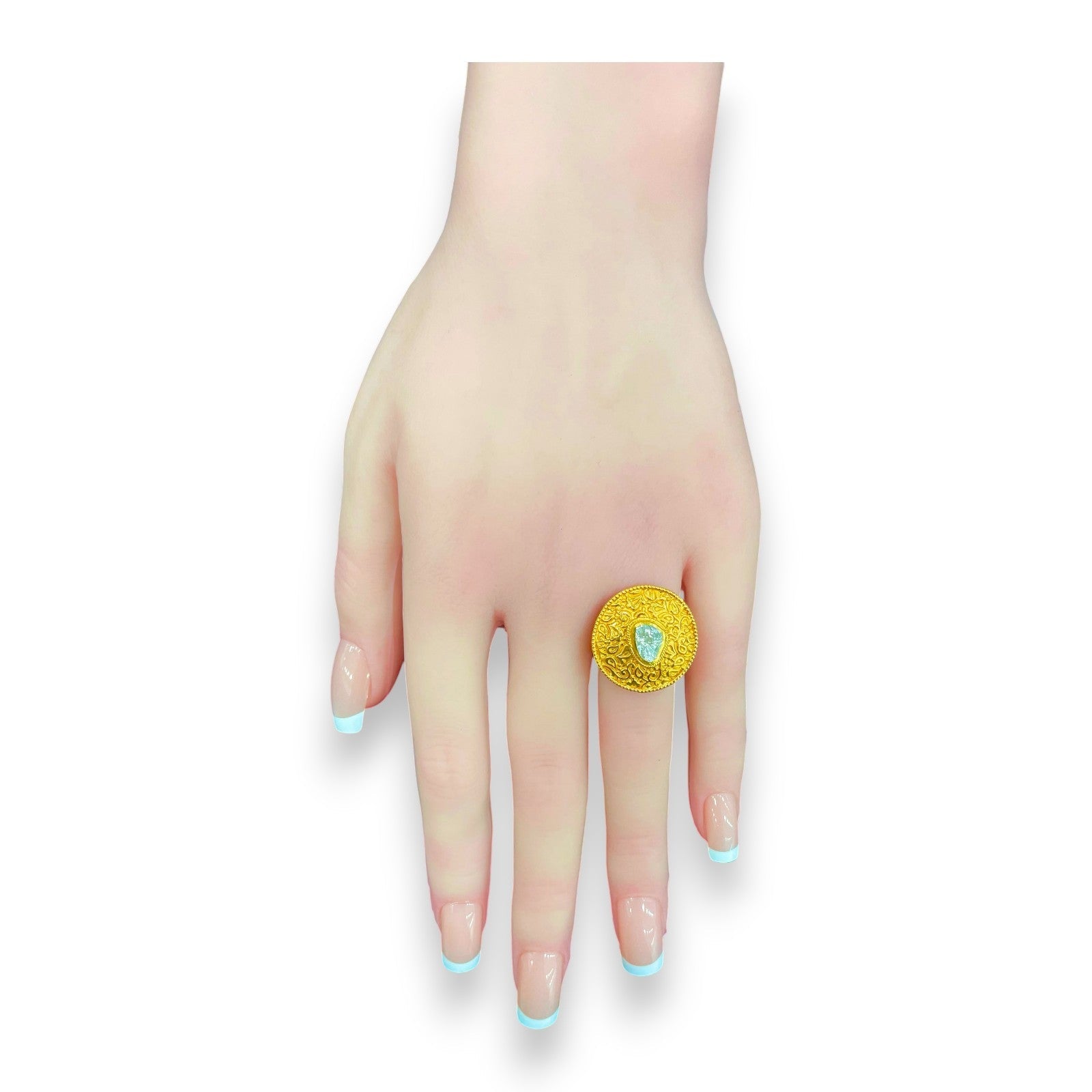 An exquisite 22kt gold ladies ring featuring a bold circular filigree design with intricate handcrafted detailing. At its center lies a raw uncut diamond, radiating natural brilliance and adding a unique character to the ornate golden frame. Perfect for weddings, festive occasions, or as a timeless statement accessory, this ring captures the essence of traditional artistry blended with elegance.