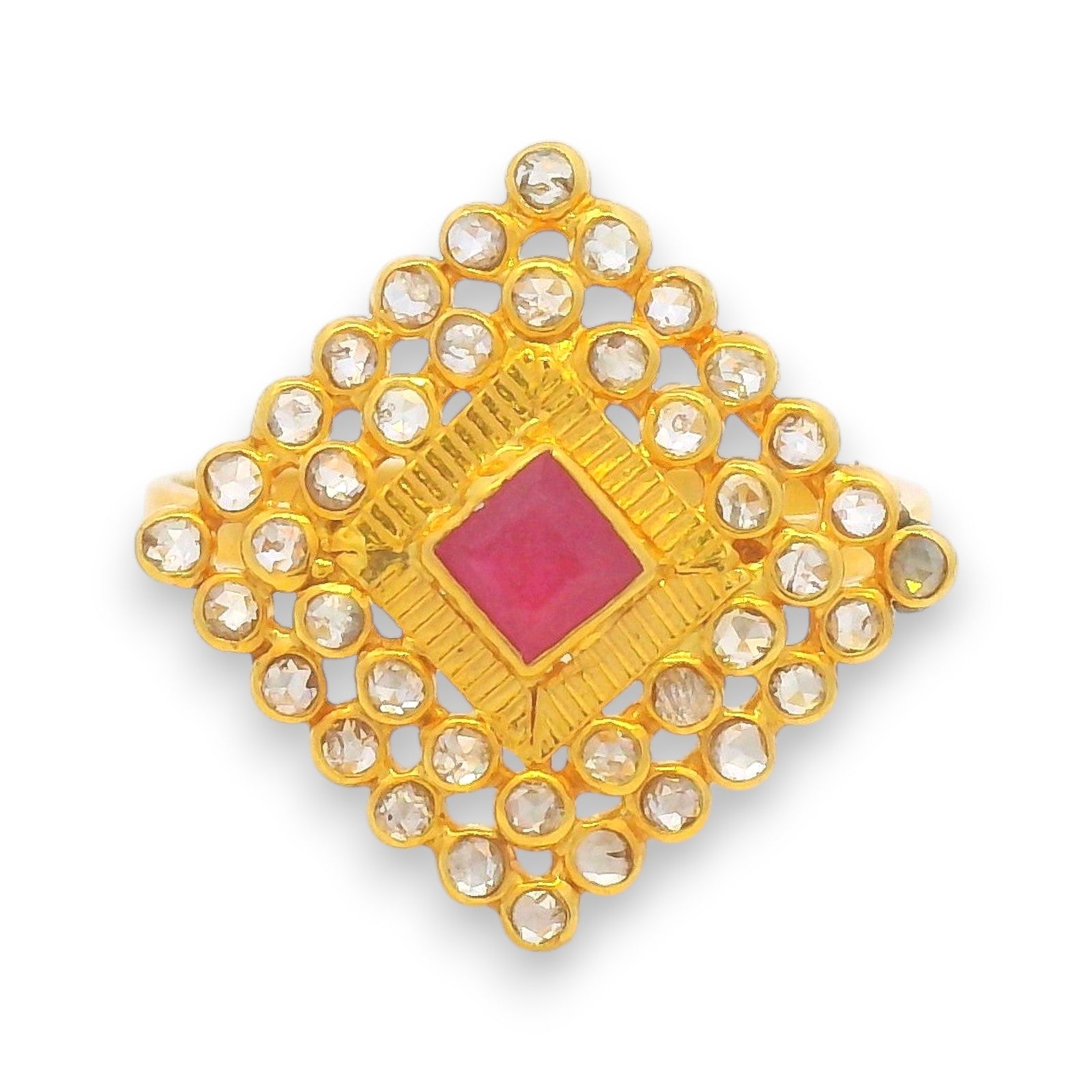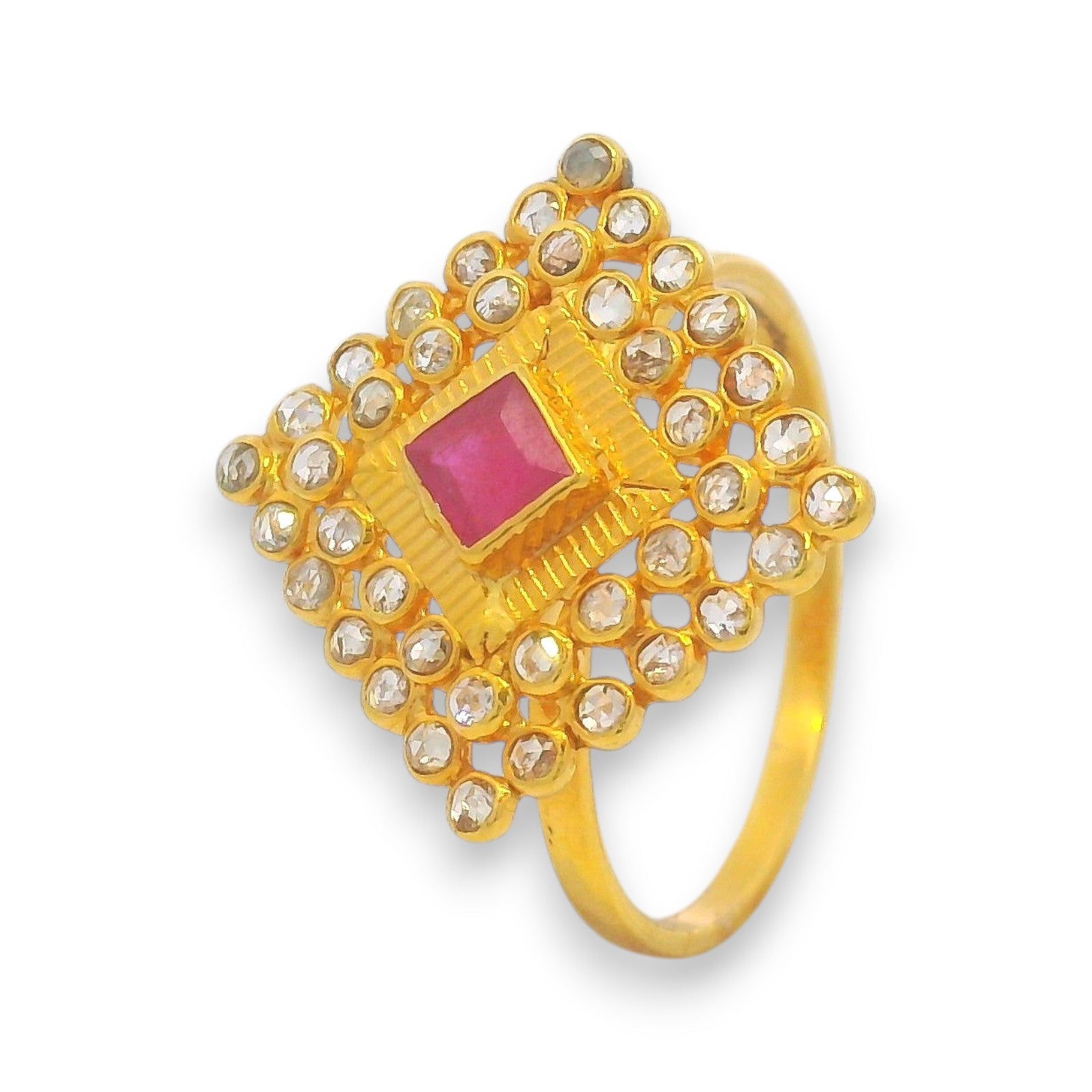 A striking 22kt gold ladies ring designed in a bold square motif, featuring a vivid ruby center surrounded by raw uncut diamonds. The geometric design with shimmering uncut stones highlights elegance and strength, making this piece ideal for special occasions or as a standout addition to your jewelry collection.