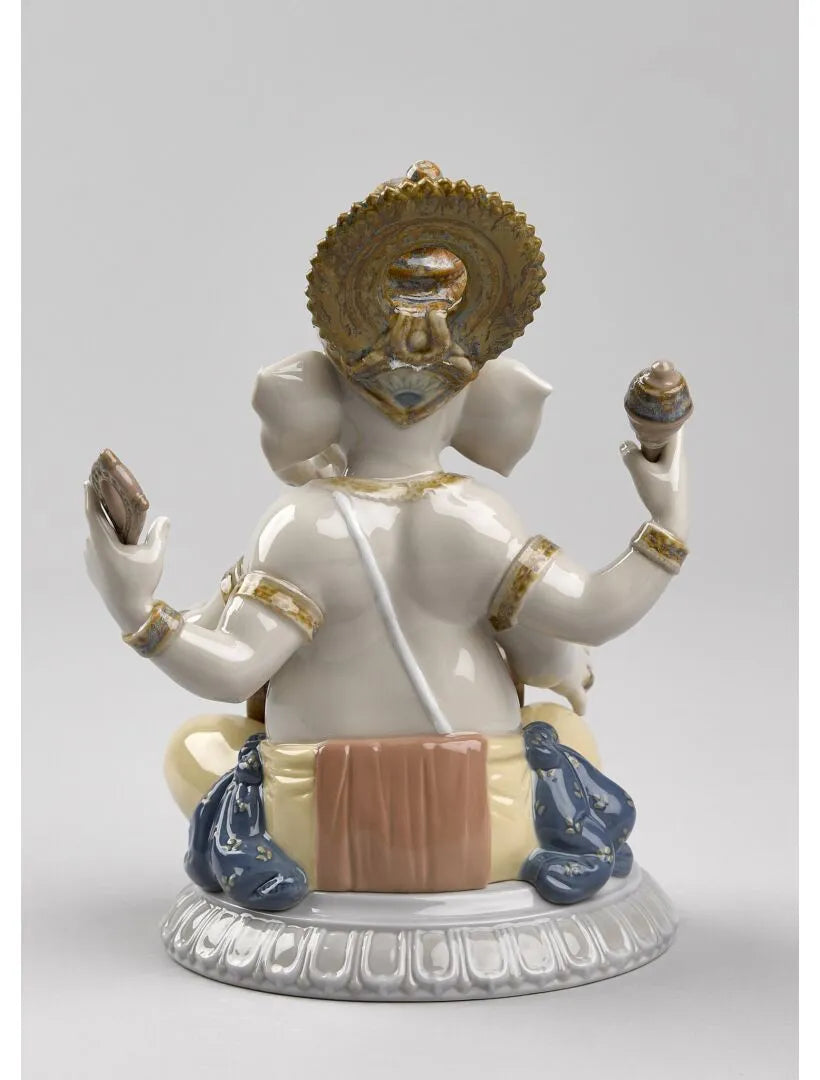 Lord Ganesha is the god of wisdom and knowledge. This deity is very popular in India, and is represented here playing the mridangam, a traditional instrument. In addition, the piece portrays other attributes of the traditional iconography of Ganesha, such as the gada (mace), the paasha (rope) and the broken fang, all elements whose symbolism is contained in the avatars, or traditional stories about Ganesha, which are known well by his numerous worshippers. This is the fourth and final part in the series of musical Ganeshas.