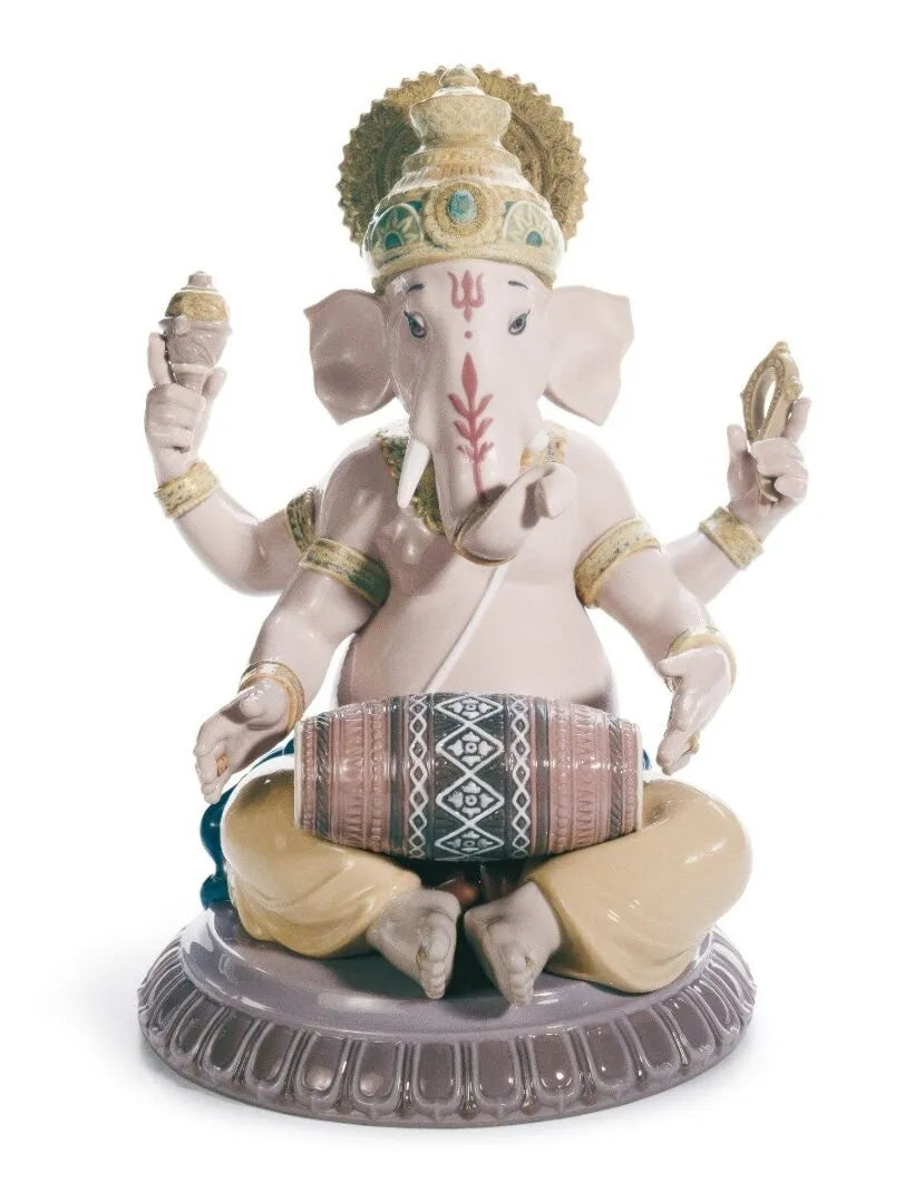 Porcelain figurine of the Hindu god Lord Ganesha, with a human body and the head of an elephant, playing the mridangam, a traditional instrument.
