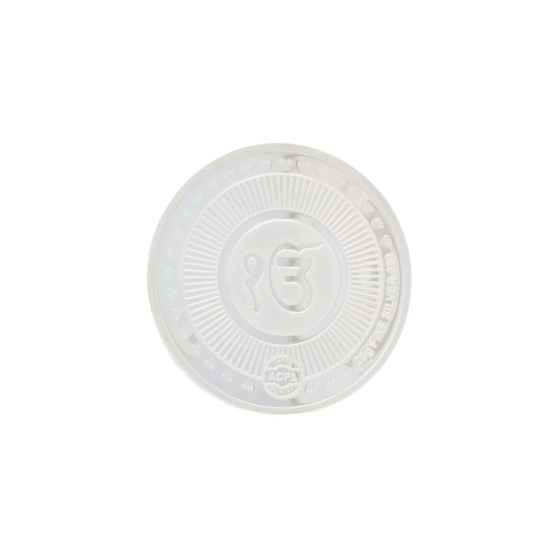 This 100-gram fine silver coin radiates divine blessings with its sacred engraving of the Ik Onkar symbol on one side, and a beautifully colored depiction of Guru Nanak Dev Ji with the Golden Temple on the reverse. Crafted with devotion and intricate detailing, this coin is a perfect keepsake for spiritual connection, religious occasions, or gifting with reverence.