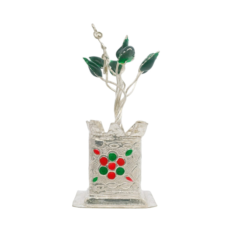 • Design: Tulsi plant with enamel detailing in a decorative silver pot